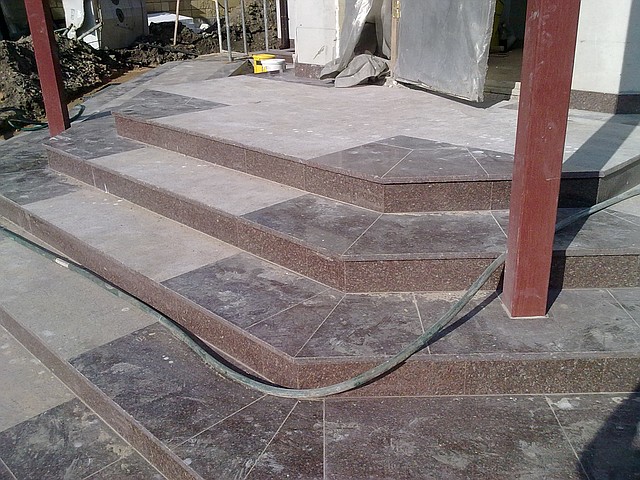 1. Щоб отримати кінцевий ефект від гармонійних, плитка повинна бути розділена симетрично. По краях, щоб отримати всі фанерованої поверхні або обрізані плитки однакової ширини, необхідно спочатку точно в середині стіни провести лінію. 2. На зовнішніх кутах стін і виступів упаковки слід починати з цілої плитки, розріз пластини кріпляться до внутрішніх кутах. 3. В проходах між приміщеннями, в яких є двері, фуги, яка відбулася на тому ж рядку (з однієї кімнати в іншу). 4. Якщо це можливо, щоб визначити висоту вільного підкладці, упаковка повинна початися в нижній частині цілої плитки і завершити всю плитку у верхній зоні. При визначених зазначеним оболонки заввишки, має розпочатися укладання плитки вниз недоторканими і оздоблений плиткою кріпиться в нижній зоні. 5. При укладанні на підлогу обличчям ви повинні спочатку визначити шнур прямої в середині підлоги, паралельно до більш довгих стінах. З цього місця починається укладання плит таким чином, щоб шнур проходить фуга або середина цілої тарілці. Підстрижені по краях плити укладаються поверхні повинні бути ширше, ніж половина всієї пластині. 6. Ніші для радіаторів прокладці частки так, щоб обрізати панелі однакової ширини були або в середині поверхні, або симетрично по її краях. Тільки у виняткових випадках можна облицювати всю поверхню цілі плити. Найчастіше по краях і в кутах, в місцях, док-станція для обробки пластини відповідного розміру. Крім того, майже завжди потрібно вирізати плитки криві або отворів. Навіть з невеликим досвідом роботи з допомогою спеціального інструменту обробки каменю, ви можете зробити це без проблем. 1. Щоб обрізати панелі по прямій лінії краще всього використовувати спеціальний верстат для різання кам'яних плит. За допомогою цього пристрою ви можете обрізати плитки з великою точністю до потрібного розміру. 2. Для виконання криволінійних пропилів повинна використовувати ручні інструменти (шліфувальні). Щоб отримати якісний вигнутий зріз повинен мати певну підготовку. 3. Укладання каменю. Пристрій виготовлено з натурального каменю в одному з двох способів. Перший спосіб укладання кам'яних Він пропонує заводська упаковка поліровані плити на розчин. В залежності від матеріалу підкладки і товщини плитки в даний час використовується кілька методів стиль. Розглянемо деякі з них. Укладання 20 мм гранітних плит каменю на бетонну підставу для клею суміші Приготовлений розчин наносять на підставу гребеня з допомогою шпателя, що приводить до рівномірного розподілу клею на площину. Це необхідно для того, щоб поверхня розчину не утворює плівку, яка зменшує міцність зчеплення з плиткою. Таким чином, склад клею слід наносити на невеликі ділянки базу по мірі необхідності. Утворення порожнеч під плиткою не допускається. Температура навколишнього повітря не повинна опускатися нижче +5 ° C і вище 38 ° C. Укладання гранітних і мармурових плит камінь 20-50 мм цементно-піщаного розчину на бетонну основу До укладання плит слід починати відразу ж після нанесення клейовий розчин на основі статі. Це важливо, оскільки установка повинна бути завершена до початкового налаштування рішення. Описаний метод передбачає укладання плит з шаром зчеплення відступу. Вирівнювання здійснюється за допомогою вібрації або вручну у важкодоступних місцях. Після укладання плит проводиться поли